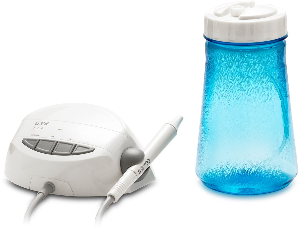 Скейлер работает на основе ультразвука. Используется для снятия зубного налёта, пародонтологических и эндодонтических операций, позволяет проводить процедуры абсолютно безболезненно. Устраняет также зубной камень, бактериальные отложения и тёмный чайный налёт без повреждения дёсен и эмали. Прибор легко интегрируется с самым разнообразным оборудованием, поскольку его наконечники оснащены разными типами разъёмов и имеют специальные ключи для установки насадок. Аппарат может функционировать как в водном режиме, так и без него. Комплектация скейлера B6-(R6) специальными резервуарами позволяет подавать автономно различные виды лечебно-профилактических жидкостей.