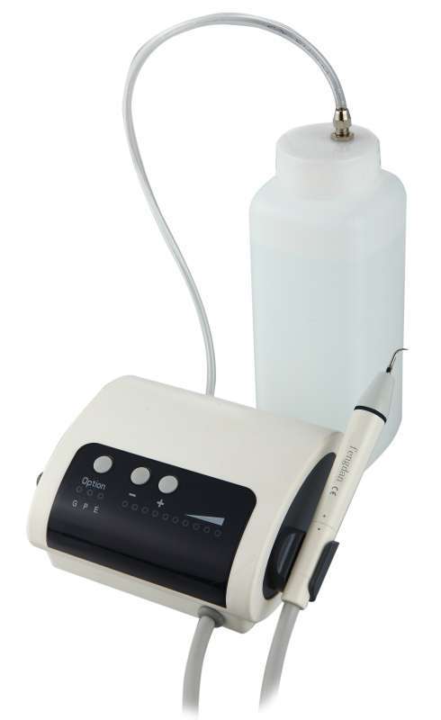 Ультразвуковой скайлер с автономной подачей воды и светодиодной подсветкой на наконечнике. Преимущества: - Эргономичный наконечник, снижающий нагрузки на кисть руки; - Автоклавируемый наконечник; - Совместимость с насадками EMS; - Светодиодные индикаторы режимов работы и интенсивности обработки; - Автономная система подачи воды, позволяет использовать прибор в любом удобном месте. Технические характеристики: - Параметры сети питания: 220-230 В; 50 Гц; 150 мА - Мощность: 3-20 Вт (регулируемая) - Частота: 30 +- 3 Гц - Вес основного блока: 0,77 Кг - Вес блока питания: 1,25 Кг Комплект поставки: - Блок управления - 1 шт. - Съемный автоклавируемый наконечник скайлера с фиброоптикой - 1шт. - Шланг скайлера - 1шт. - Ключ - 1шт. - Электрический блок питания - 1 шт. - Емкость для воды - 1шт. - Трубка подачи воды - 1шт. - Насадки для скейлера (6шт.) - G1 (2шт), G2, G4, P1, эндочак - Педаль ножная - 1шт. Насадки: - G1 -универсальная насадка для снятия незначительных отложений зубного камня, слабовыраженного адгезивного налета, гигиенических процедур. - G2 -универсальная насадка для снятия значительных отложений зубного камня и адгезивного налета. - G4 - универсальная насадка для снятия незначительных отложений зубного камня и удаления пятен от табака, чая кофе. - P1 - насадка для удаления зубного камня в неглубоких карманах. Благодаря своей тонкости, эта насадка идеально подходит для работы с проксимальными поверхностями.