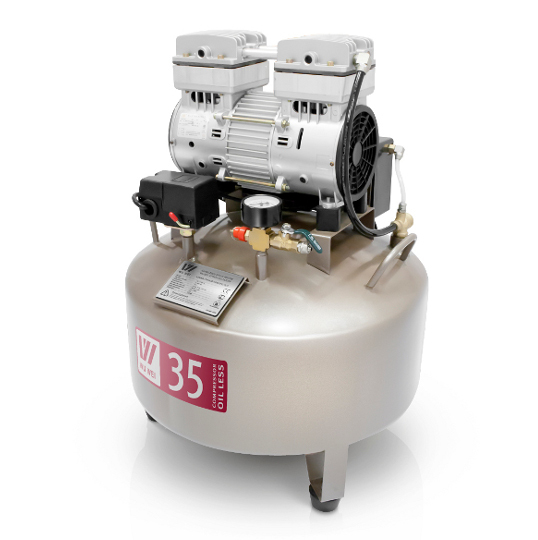Данный тип высококачественных компрессоров создан по безмасляной технологии и отличается высокой стабильностью в работе, минимальным износом движущихся частей. Компрессоры этого типа отличаются высокой производительностью, низким уровнем шума, функцией автоматического отключения мотора-нагнетателя после того как закачанный в ресивер воздух достигнет рабочего давления. По мере падения давления мотор также автоматически включится. Данные компрессоры будут идеальны для стоматологических клиник различного размера, зуботехнических лабораторий и ювелирных мастерских. Технические характеристики Применение: для 1 установки Напряжение: 220В, АС 50 Гц Мощность потребления тока: 550 Вт Производительность: 70 л/мин Максимальное давление: 0,8 МПa Объем ресивера: 35 л Шумность: 62 дБ Вес: 30 кг Размеры (ШхГхВ): 460х460х650 мм